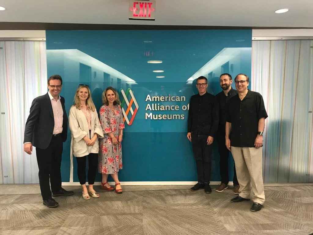 UK delegation to American Alliance of Museums (AAM). From right to left, Ross Parry (University of Leicester), Sophie Frost, Anra Kennedy (Culture24), Simon Stephens (Museums Association), Daffyd James (National Museum Wales) and Dean Phelus (AAM), July 2019.